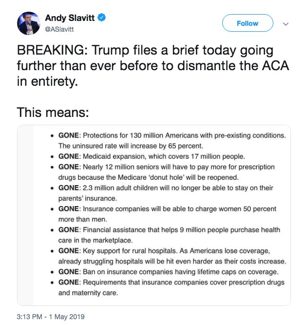 소송이 성공하고 법원이 오바마케어라고 하는 법을 폐지하기로 결정할 경우, 이를 대체할 의료 보험제도가 수립되지 않은 상태에서 수백만 명의 미국인이 건강 관리를 잃을 수 있습니다. 트럼프는 2020년 선거 이전에 새로운 공화당의 플랜으로 법안을 대체하기를 원했지만 공화당은 하원에서 다수를 차지할 때까지 자체의 법안을 진전시키지 않았습니다. .