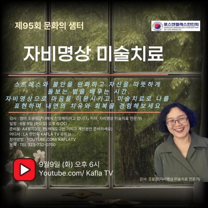 이러한 활동의 일환으로, LA 한인회(회장 로버트 안)는 오는 9월9일(화) 오후 6시에 제95회 ‘문화의 샘터 “자비 명상 미술 치료” 온라인 강좌인 을 개최합니다. 이번 강연에는 스트레스와 불안을 완화하고 자신을 따뜻하게 돌보는 법을 배우는 시간 자비 명상으로 마음을 이완시키고, 미술치료로 나를 표현하며 내면의 치유와 회복을 경험하게 됩니다.
