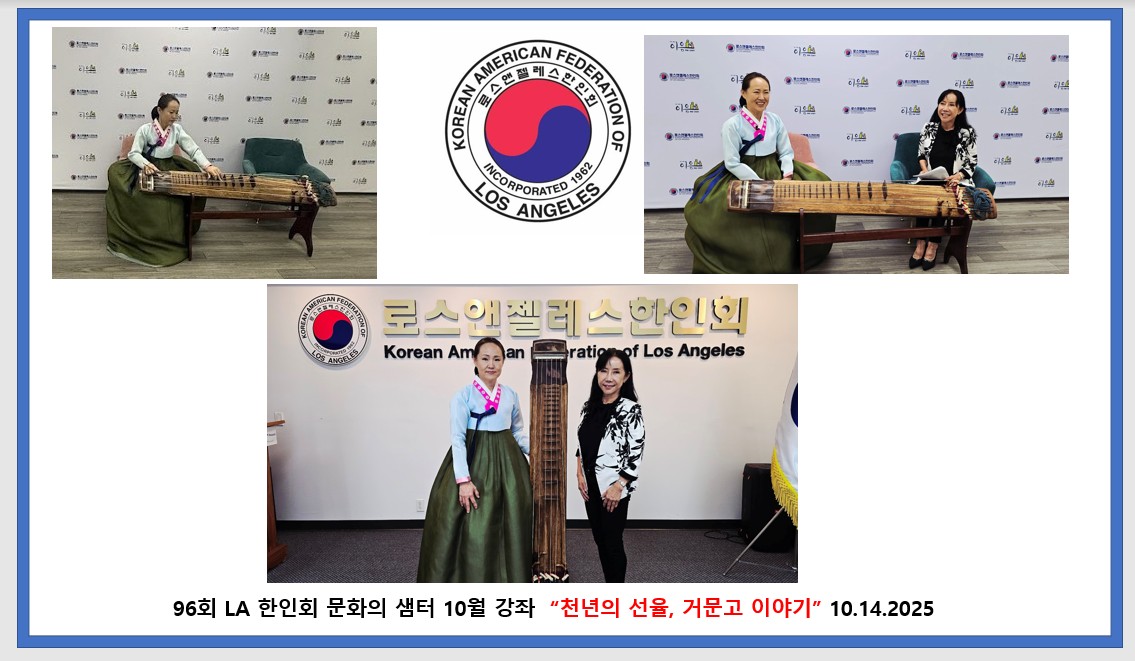 이러한 활동의 일환으로, LA 한인회(회장 로버트 안)는 오는 10월14일(화) 오후 6시에 제96회 ‘문화의 샘터 “천년의 선율, 거문고 이야기”