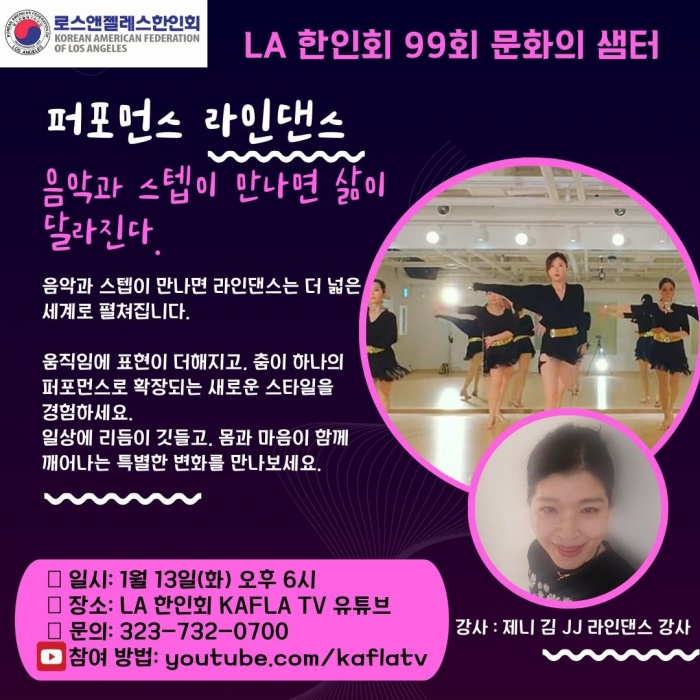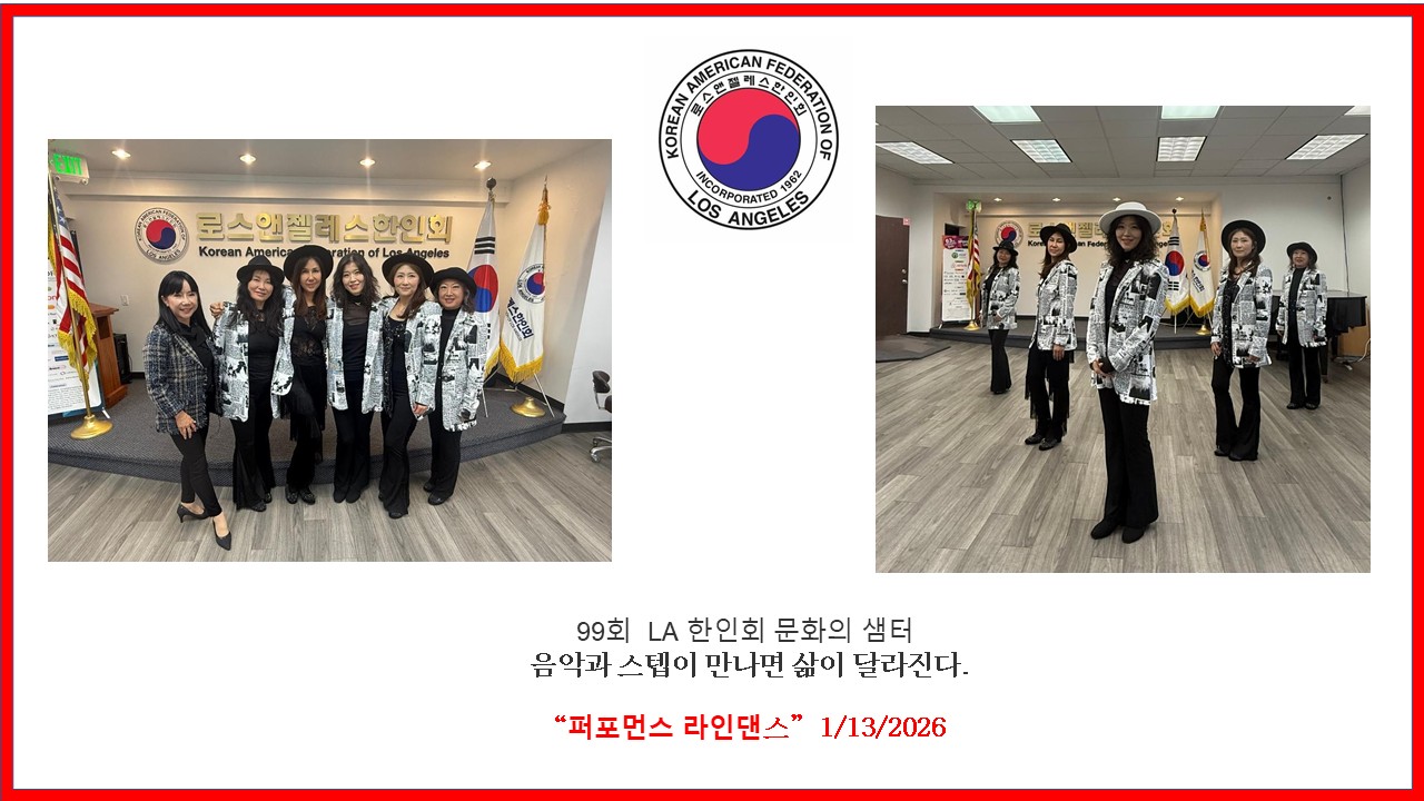 LA한인회(회장로버트안)는1962년설립된이후지역사회와함께성장하며,동포들의권익보호·교육·문화진흥을위해다양한프로그램을지속해왔습니다. ‘문화의샘터’는매달둘째주화요일열리는대표온라인문화예술강좌로,지금까지99회를이어오며한인사회의문화적역량을높이는중요한역할을해왔습니다.
