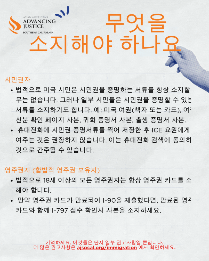 미국 시민과 영주권자는 신분 증명서류를 필요에 따라 소지하세요. 서류미비자, DACA 수혜자, 비이민 신분자 등은 권리를 보호할 수 있는 서류를 준비하는 것이 중요합니다. 사랑하는 사람이 구금되었다면, 관련 정보를 기록하고 즉시 신고하세요.