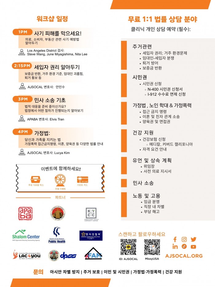 11월 1일 LA 한인타운 미주평안교회서 무료 워크샵 및 법률 상담, 다양한 한인 단체 및 정부기관이 참여하여, 복지 및 건강 서비스 정보 제공합니다.