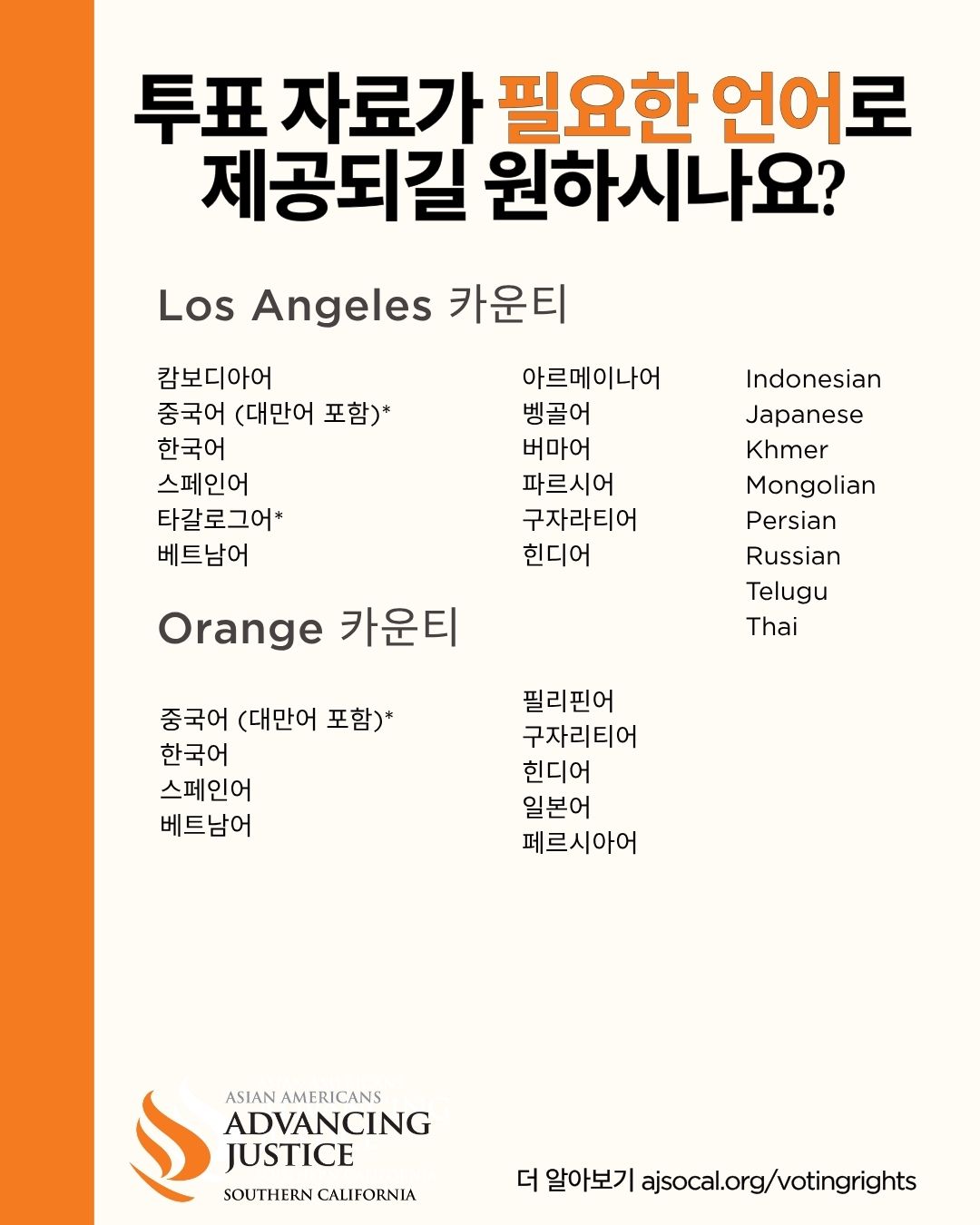 더 많은 자료와 지원(8개 이상의 언어로 유권자 지원 포함)을 원하신다면 ajsocal.org/votingrights 에서 확인하세요.