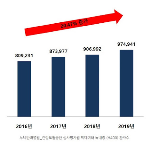 한국의 건강보험 공단 심사평가원 자료에 따르면 2019년 녹내장 인구가 97만명을 돌파했는데 2년이 지난 2021년 현재는 100만명을 넘은 것으로 추정되고 있습니다.
