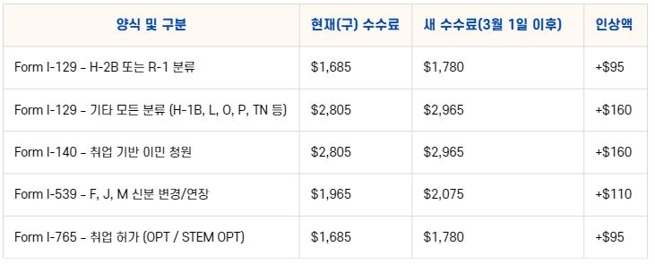 이번 인상은 소비자물가지수(CPI-U)를 반영한 것으로, 기업 고용주뿐만 아니라 유학생, 가족 동반자 등 신속한 심사가 필요한 모든 신청자에게 실질적인 영향을 미칠 것으로 보입니다.