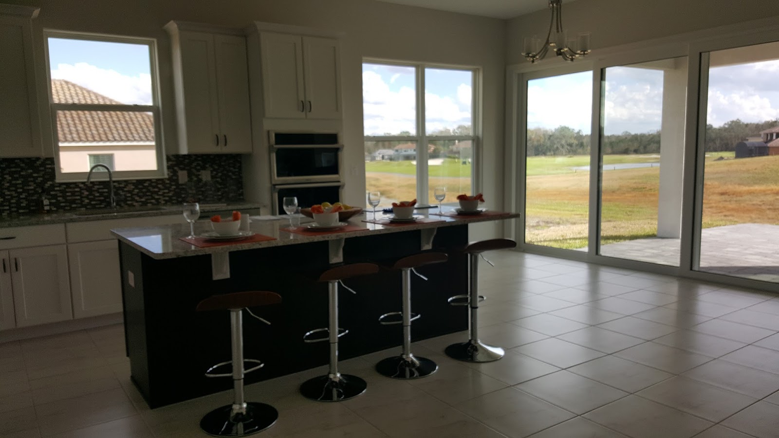 팜트리 사이로 골프 코스가 내다 보이는 뒷뜰과 그 사이 산책로 보이시죠?