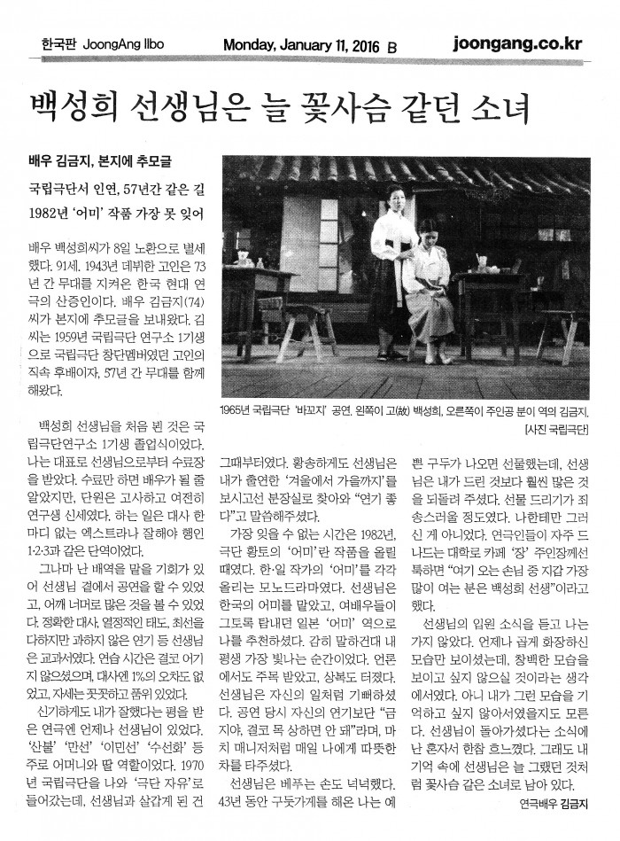 故백성희(원로연극인/2016년1월8[금]일 별세/91세)님
