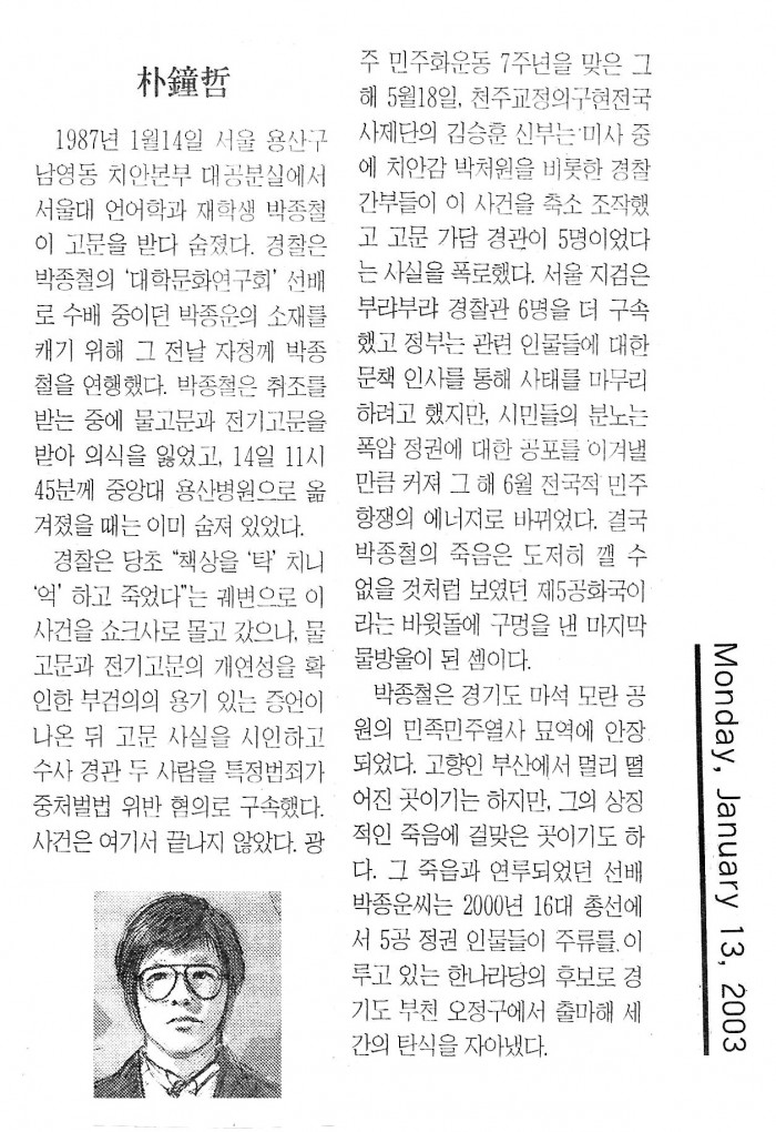 故박종철(1987년1월14일/고문中사망)님