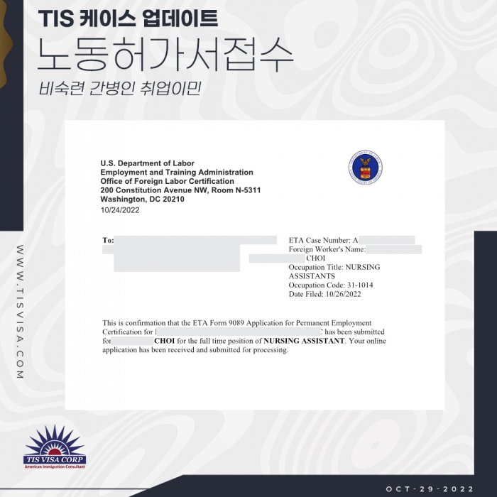 간병인으로 미국 취업이민을 진행중이신 분들의 노동허가 접수 소식을 전해드립니다. 노동청 수속기간이 길어져서 현재는 8~14개월의 수속기간이 예상됩니다. 노동 허가서가 승인되면 그 다음은 이민 청원서의 순서가 진행 됩니다. 좋은 결과, 좋은 소식이 있을 때까지 최선을 다하겠습니다.