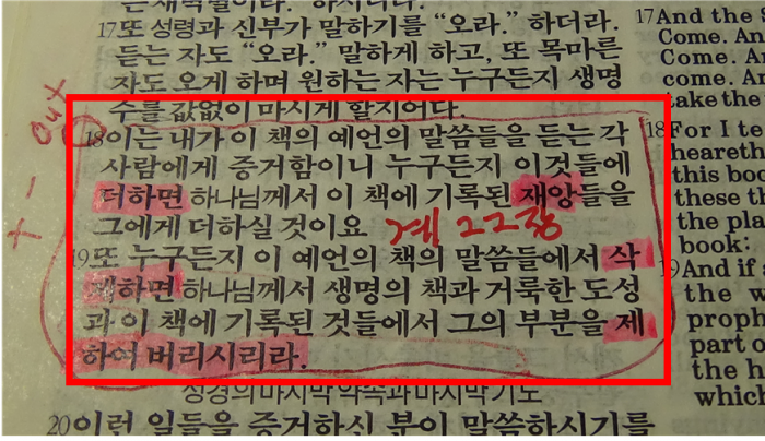 하나님의 말씀을 더하거나 빼거나 해서 전하면 반드시 저주를 받는다고 기록 중입니다.