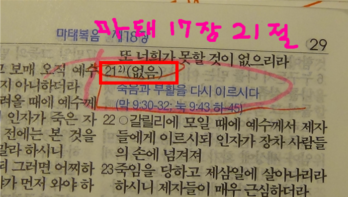 아래 개역 개정 성경 마태복음 17장 21절 구절 삭제 되어 있습니다.