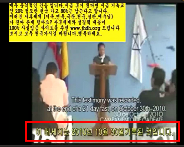 위 사진 15년전 에콰도르 안젤리카 당시 여학생 천국 지옥 간증 3번째 간증에 그 당시 예수님 재림 하시면 구원 받고 휴거 될 자들이 지구 전체 이단 교회 뻬고 정산인 교회 중에 20% 들림 받을 것이라고 천사가 이야기 하면서 지상에 가서 전하라는 내용 중에 성경 계시록 두 증인 사역과 계시록을 모르시면 8명 중에 2명은 구원 받았구나 착각 하실수 있습니다. 분명히 예수님 공중 재림 추수때를 말씀 하셨기에 추수전에 3년5개월 동안 대대적인 두증인 전도 시각으로 20%를 보셔야 됩니다.
