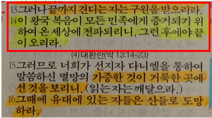 끝이 오리라.--(여기서 세상 끝이란 예수님이 대 환란 때를 설명 하시는 중이기에 환란 시작 중에 두 증인 복음 전도 42개월 끝나면 세상 심판 휴거가 있다는 뜻으로 보여 집니다. 마지막 때 전하는 복음을 왕국 복음으로 혹시 표현하셨을까요? 참고로 세상 심판 끝에 천년 왕국이 시작이 됩니다.))