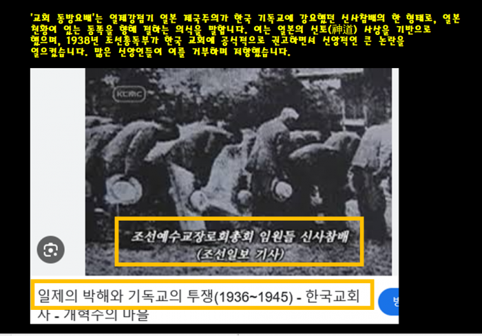 신사 참배란 교회서 예배 드리기 전에 일본 살아 있는 인간 신 천황에게 절을 3번하고 뭐라뭐라 하고 예배드렸다고 합니다. 먼저 일본 귀신에게 우상 숭배하고 하나님이신 예수님께 예배드렸다는 뜻입니다.