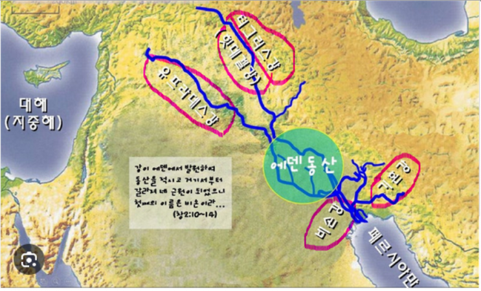 아래 10절 강줄기를 성경 기록 시각으로 에덴 동산 추측 위치