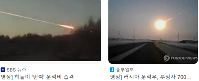 둘째 천사가 나팔을 부니, 거대한 산이 불에 타서(하늘에서 큰 운석이 떨어지면 열 받아 불이 붙어 떨어집니다. 실제 운석 떨어지는 사진 입니다.) 바다로 던져지는 것 같더니 바다의 삼분의 일이 피가 되더라.