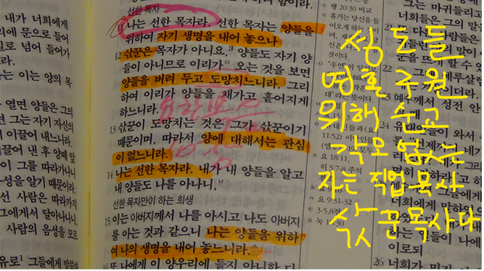 선한 목자는 양떼 위해 목숨을 내어 준답니다. 순교 각오로 양떼 영혼 구원 위해 노력 하지 않으면 예수님 입장에서 보시면 삯꾼 목회자입니다. 틀렸습니까?