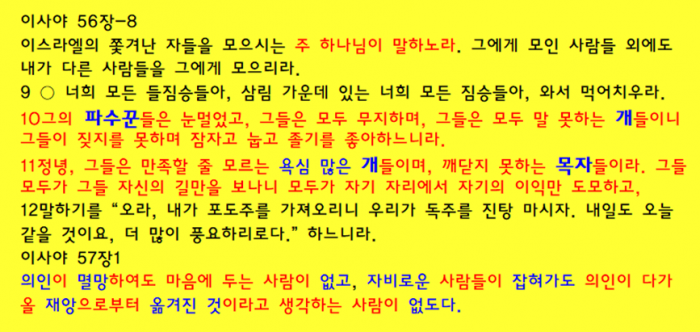 아래 구약 시대 자격 미달 지옥 갈 목회자들 파수꾼인 제사장 선지자들에게 하나님이신 예수님께서 한 말씀 하시네요. 지금 주의 종으로써 책임과 의무를 다하지 아니하는 지금 목회자들에게 하시는 경고입니다. 개는 주인보다 더 맛있는 고기 밥 주면 주인 배신해 버립니다.