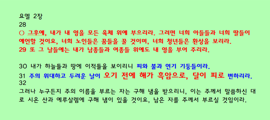 그리고 주의 위대한 날은 세상 심판 날이며 예수님 재림 휴거 전에 땅에서 이런 환란과 하늘에 이런 증거들이 있고 난 후에 추수 심판 날이 온다고 명백하게 기록 중입니다.