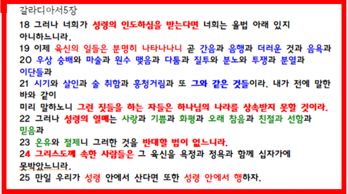 21-시기와 살인과 술 취함과 흥청거림과 또 그와 같은 것들이라. 내가 전에 말한 바와 같이 미리 말하노니 그런 짓들을 하는 자들은 하나님의 나라를 상속받지 못할 것이라.