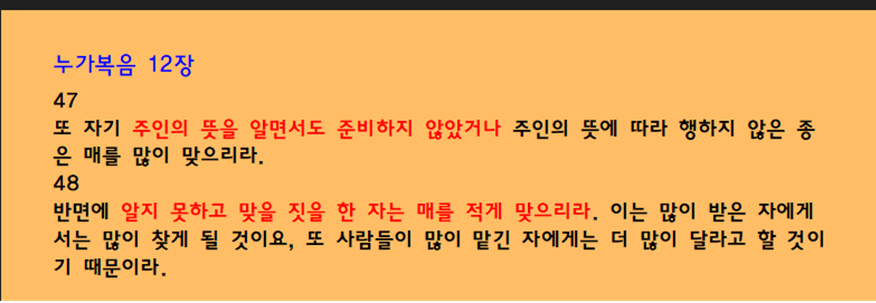 신약성경 지시대로 행동으로 마음으로 순종치 않으면 지옥으로 보내신다는 심판 규칙을 알려 주시고 계십니다. 예를 들면 구약시대 제사장도 아니고 현재 목사님들이 주일 설교 한 시간 하고 다른 성경지시 들은 무시하고 티비 보고 골퍼치고 각종 세미나 모임이나 돌아다니는 목회자들이 해당이 되겠네요.