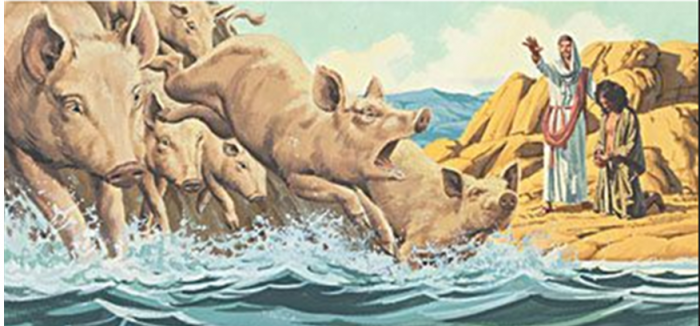 마귀들이 그 사람에게서 나와 돼지들에게로 들어가니 그 돼지떼가 비탈길을 내리달