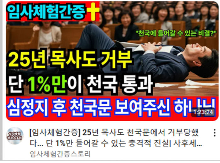 ---지금 올라오는 임사체험 간증에는 한국교회 목사 성도 포함해서 1% 정도 구원 받고 천국에 가고 나머지 99%는 지옥 가고 있답니다. 여러분 무섭지 않습니까?