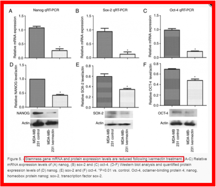 이버멕틴은 "줄기세포 특성 유전자"를 감소시킵니다 . 암 줄기세포(CSC)는 회복력을 부여하는 유전자를 발현하는데, 이버멕틴은 이러한 유전자의 발현을 억제하여 CSC를 더욱 취약하게 만듭니다.