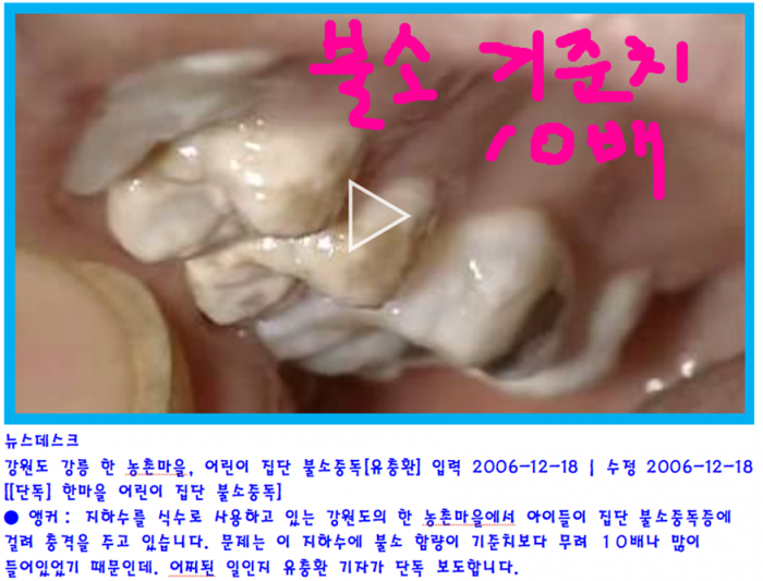 ---이분 폭로 내용 중에 불소 수도에 투입하되 언론에 공개한 저독성 불소가 아닌 고독성 여러분 신경 병 걸려 서서히 죽일 농도로 투입을 본인이 지휘 했다고 폭로 중입니다. 이빨 분만 아니고 내 몸 전체 망가뜨리고 있는데 지구 전체 병원 마다 환자들이 넘쳐 납니다.