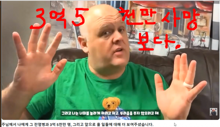 --- 브렌든 목사님 예언에 3억 5천 만명 사망 장면 환상으로 보았답니다. 계시록 4번째 봉인 열린 이 시점에 수년 안에 일어 날거 라는 예언입니다. 이분이 트럼프 대통령 귀에 총알 지나 간다는 예언하신 미국 목사님입니다.