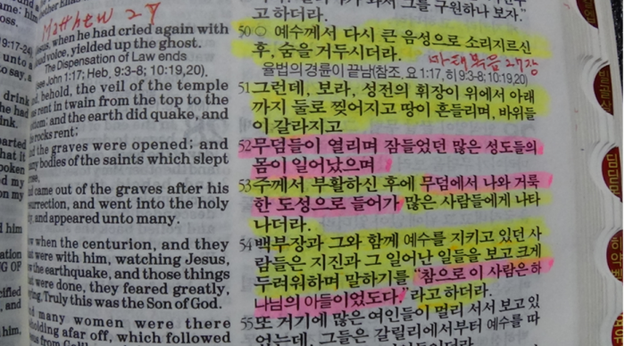 ---십자가 지신 목적--순교와 동시에 율법에 의한 성전 제사는 끝이라는 증거로 성전 휘장을 찢으 셨고 그리고 구약시대 구원 받고 죽은 영혼들이 거룩한 도성이 죄 없는 지역이 천국이기에 이때 천국 들어 갔다고 기록 중이네요. 그리고 십자가 지신 목적 중에 만민이 누구나 예수님 믿고 구원 받은 영혼들 천국 데려 가시기 위하여 십자가 순교 하셨다고 성경에 기록 중입니다.