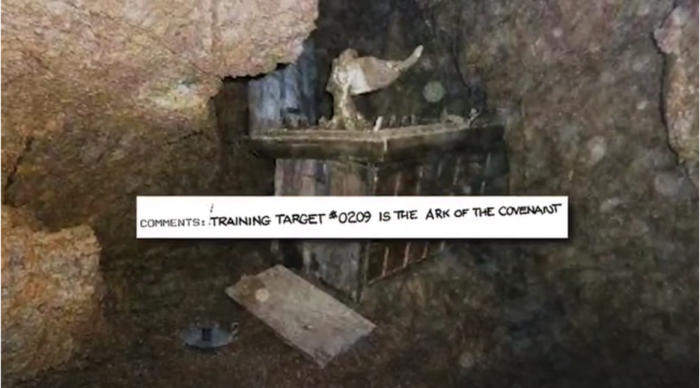 그가 그 방에서 본 물건들 중 확실하게 식별할 수 있다고 생각하는 것은 돌 상자 안에 있는 언약궤입니다.