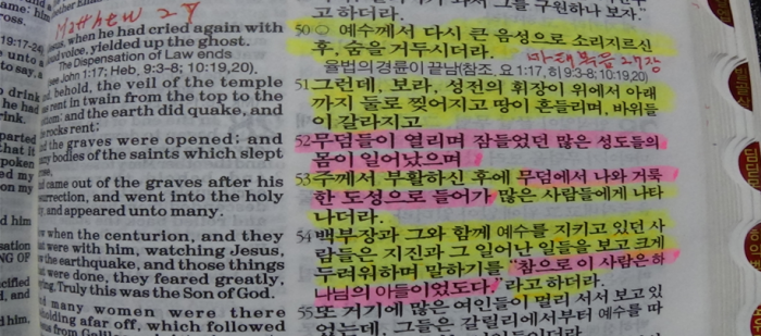 ---그리고 예수님 순교로 위 52절에 구약시대에 하나님께 구원 받은 영혼 들이 예수님 십자가 순교를 하시지 않아서 천국 가는 영적 길이 만들어지지 않아서 그동안 지하에 대기하고 있다가 비로써 예수님 십자가 순교로 천국가는 길이 영적으로 만들어져서 구약시대 구원 받은 자들이 천국으로 들여 올라 갔다고 기록중 입니다. 역시 예수님 십자가 순교하신 목적들 중에 한가지입니다.