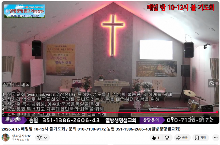 오직 예수님 외에 누구도 해결이 불가능 합니다. 미국이 도와 줄려고 해도 한국교회가 기도를 하지 않는데 왜 도와 주겠습니까? 예수님께 귀가 따갑도록 부르 짖읍시다. 아래 링크 클릭해 주세요. 매일 밤 10시입니다. 교회 작지만 예수님께 사랑 많이 받고 크게 쓰임 받는 목사님 입니다. 두고 보세요.