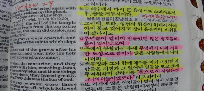---그리고 53절에 보시면 예수님 십자가 순교 후 영적 천국가는 길을 만들어 주셨기 때문에 구약시대에 율법에 의해 구원 받고 죽은 성도들이 예수님 순교로 천국가는 길이 이제 만들어 져서 다들 천국에 올라 갔다고 명백하게 기록 중인데