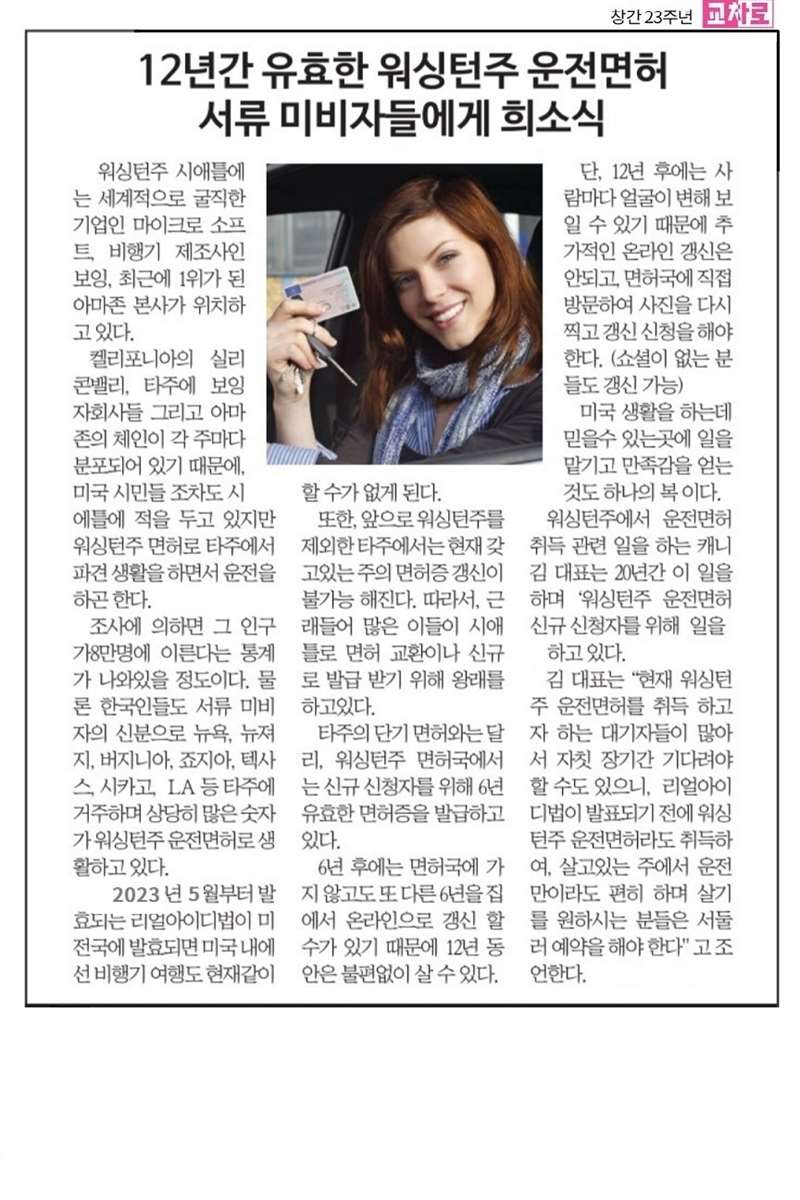 그런면에서 6년+6년 안오시고 12년 동안 유효한 워싱턴주 운전면허 를 이미 많은 서류미비자들이 선호를하여 발급받아 타주에서 운전을하시고 계시는 이유입니다.한국정부와 협약체결에 의해서 한국서류도 접수 신분증명서류로 인정을해주는 워싱턴주 면허 접수서류는 한국인이면 누구나 쉽게 동사무소/영사관에서 접수서류를 발급해줘서 전혀 위조서류가 필요 없습니다.오죽하면 여권없는분들도 쉽게 면허를 발급을 받고 계시는 요즘입니다.