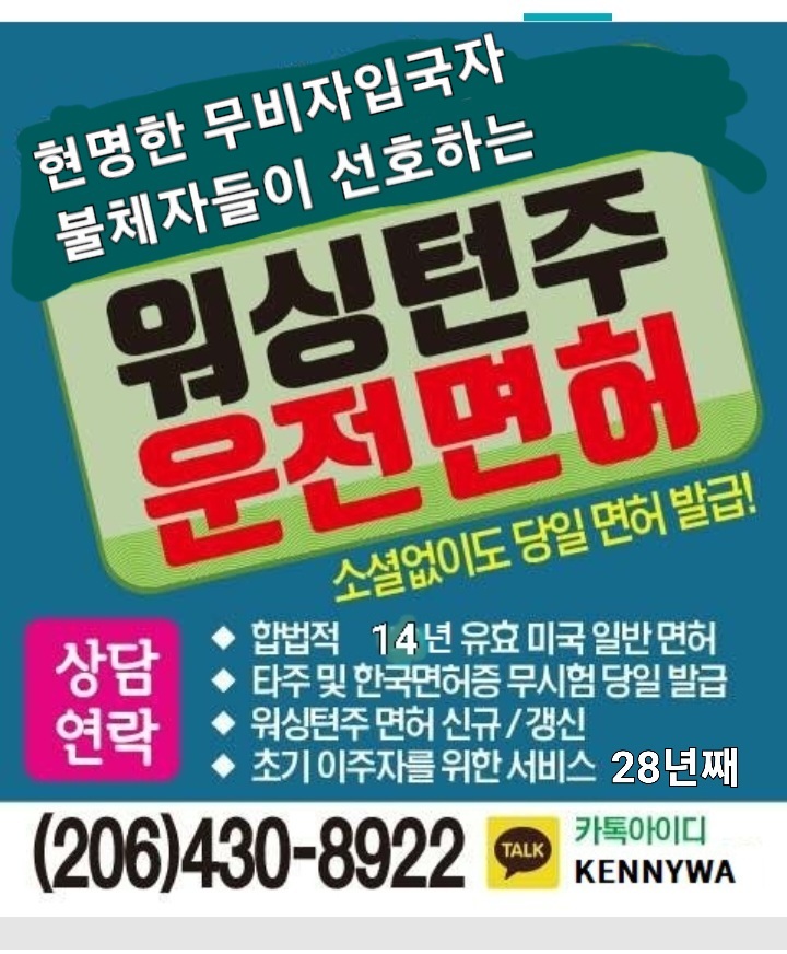 이러한 위에,여러가지 이유로 워싱턴주 시애틀 운전면허를 많은 무비자입국자,서류 미비자들이 선호를하고 많이 발급을받으셔서 현재사시는주에서 운전을하면서 생활전선에 임하시고들 계시는것 입니다. 참고로 해주시면 미국생활에 도움이 되실것 입니다!!