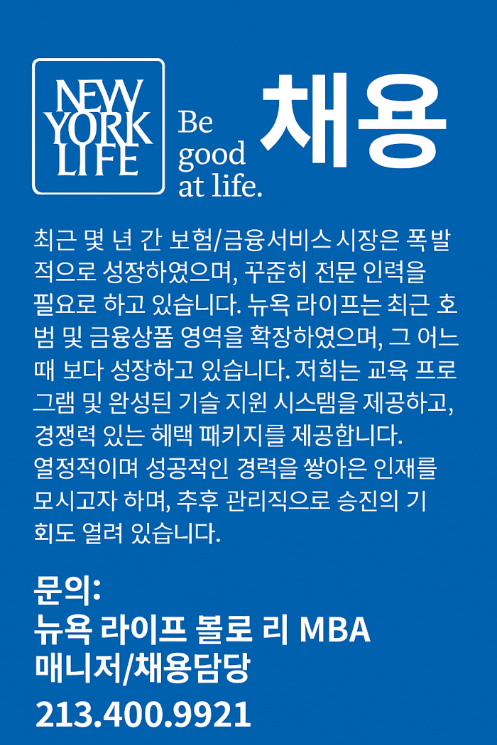 제목HIRING 볼로 리 뉴욕 라이프 재정 설계사 MBA 213.400.9921