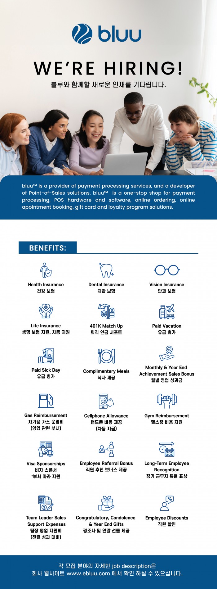 미국 아시아 시장 1위 POS 솔루션 기업 Bluu, Inc.에서 도전적이고 열정적인 영업 담당자를 찾습니다! 우리는 최신 기술로 기업 우영을 간소화하며 빠르게 성장하고 있습니다.