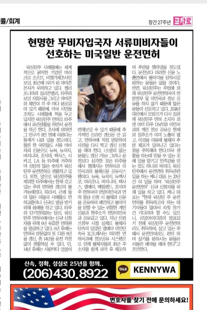 ** 인터넷에 떠도는 타주에 도우미들의 감언이설에 속지 마시기 바랍니다. 워싱턴주 면허법이 바뀌였습니다. 이사실을 모르고 타주도우미들이 이곳 면허를 신청한들 AI 인공지능 시스템에 타주 아이피 주소가 걸려서 결국에 취소가되여 평생 미국 50개주서 면허 발급이 중지되는 불이익사태는 피하셔야겠죠? 오늘도 피해자가 많이 있습니다. 조심하십시요! **2026년2월현재**