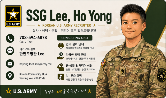 "미군 육군 한인 모병관이 직접 캘리포니아에서 뉴욕까지, 미국 어디에 계시든 미군 입대에 관한 가장 정확한 정보를 드립니다."
