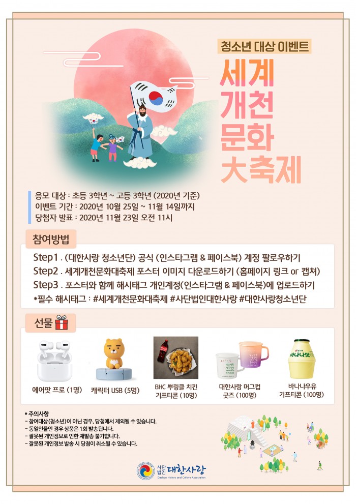 10월 3일(음력) 개천절은 환웅이 동방의 첫 나라, 배달을 세운 날! 올해 개천절을 기념하여 전 세계인과 함께 하는 페스티벌이 열립니다. 새로운 역사를 만들어가는 K-History, K-Culture, K-Spirit을 온라인으로 만나보실 수 있습니다.