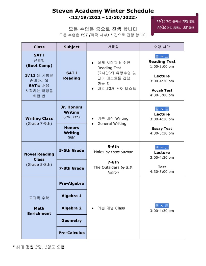 ▶ 겨울방학 정규강좌 할인 안내- 11월 15일까지 등록시 10% 할인