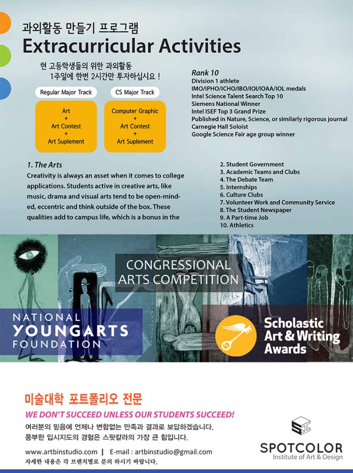 과외활동준비반은 year-round로각시기별로아트서플멘트및공모전을준비하며, 다른학생들과경쟁에서효과적인