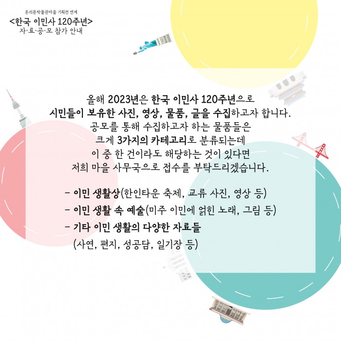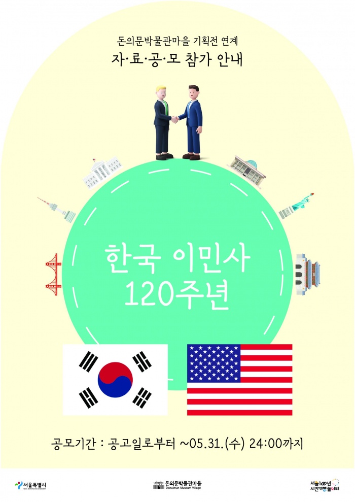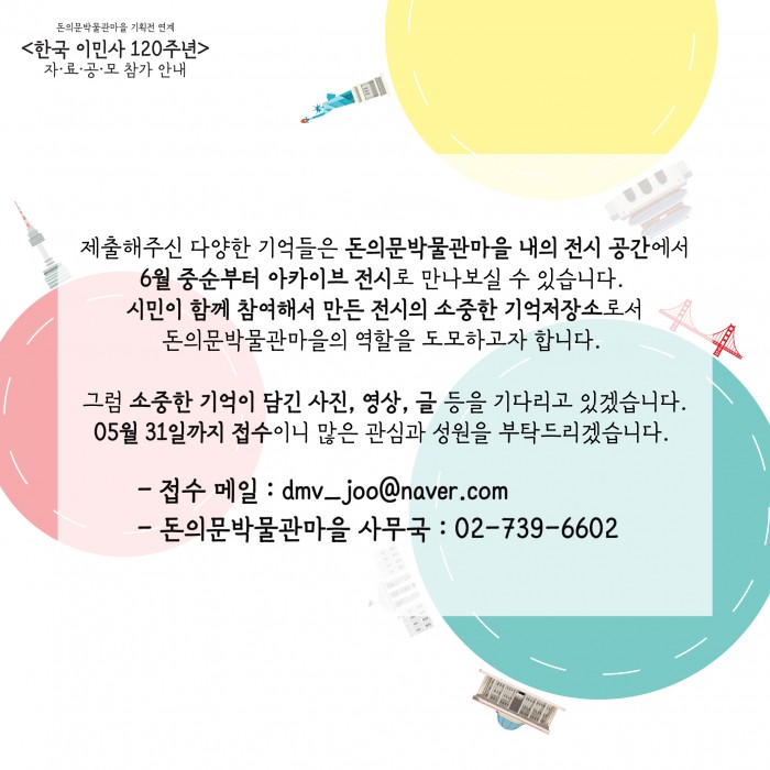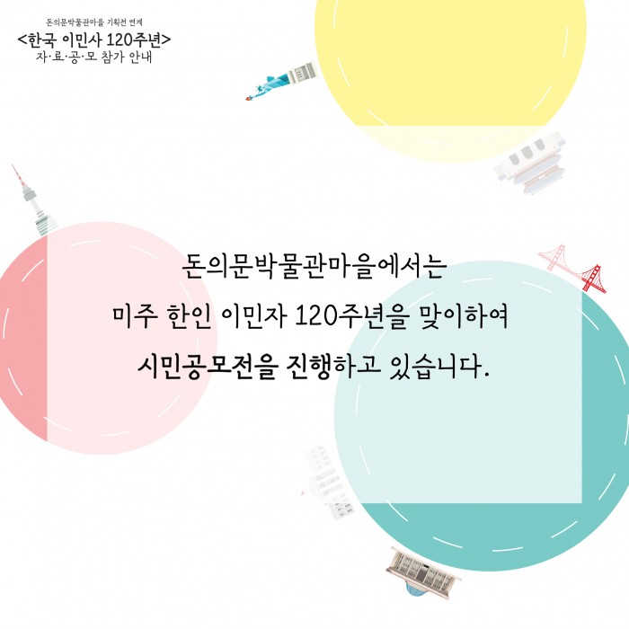 <한국 이민사 120주년>을 맞이하여 관련 기억과 추억이 담긴 내용들을 공모합니다. 소중하게 모아진 자료들을 6월 13일(예정)부터 돈의문박물관마을 전시 공간에서 전시하고자 합니다. 재외한국인들이 ‘미국’ 정착과정 및 이민 생활 중 겪은 다양한 사연과 생생한 삶의 이야기를 듣고, 함께 이해하는 소통의 장을 마련하기 위해 이번 전시를 준비하였습니다.