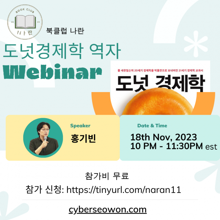 2023년 북클럽 나란 정기모임은 북클럽 창립 3주년을 기념하여 도넛경제학 역자이신 홍기빈님을 모시고 도넛경제학 웨비나로 진행됩니다.