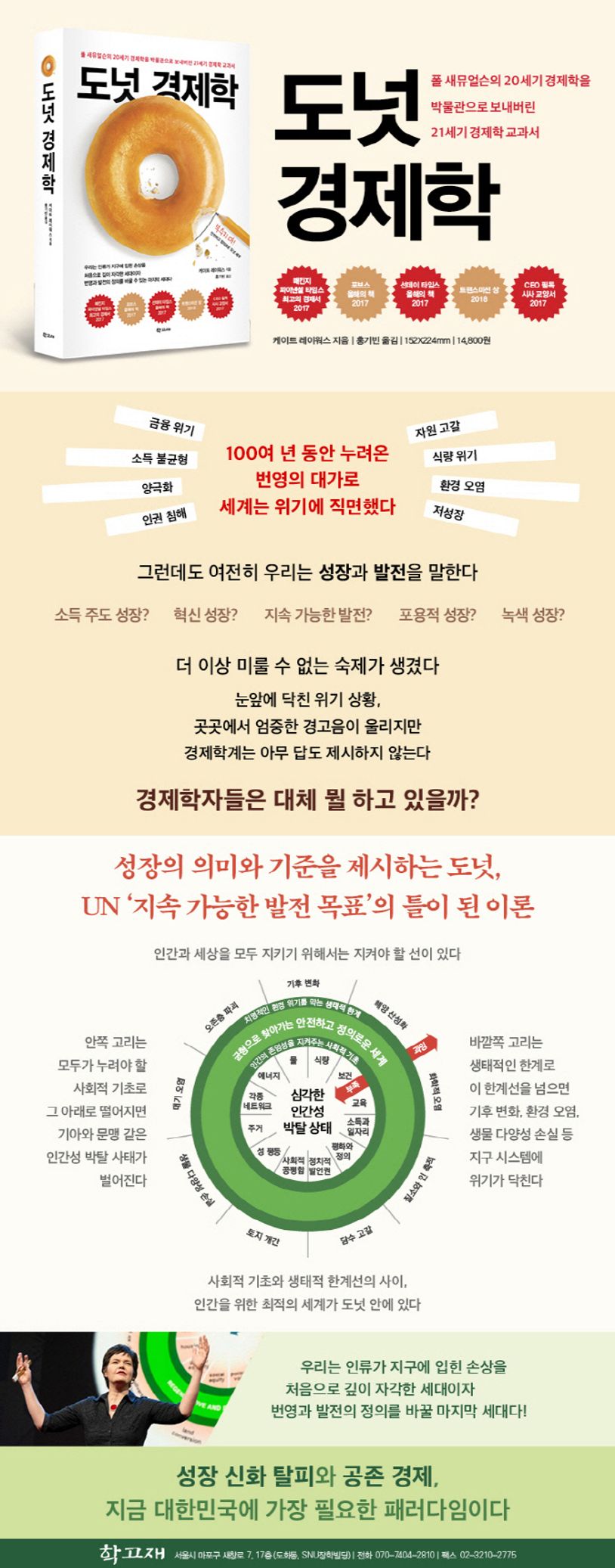 UN의 "지속 가능한 발전 목표"의 틀이 된 도넛경제학은 사회적 기초와 생태적 한계 사이에서 인류 번영의 비전을 제시합니다. 성장 위주의 주류 경제학이 몰고온 부작용으로 사회적 불평등과 환경 파괴가 심화되었습니다. 인류의 번영과 평등을 보장하는 동시에 지구를 보호하는 경제 시스템이 절실히 필요합니다. 21세기 영향력있는 여성 경제학자 케이트 레이워스는 기본부터 재생적이고 분배적으로 설계된 도넛경제학을 제시합니다. 한국어판 역자인 글로벌정치경제연구소 소장 홍기빈님을 통해 도넛경제학에 대해 배워보고, 우리에게 던지는 의미를 생각해보는 시간이 되었으면 좋겠습니다.