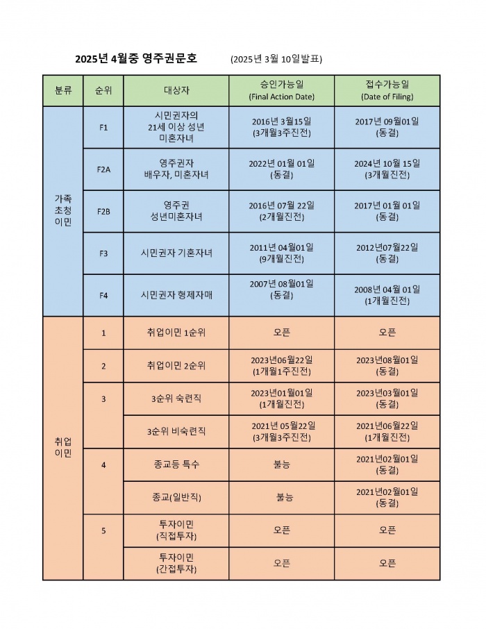 미국 국무부(DOS)는 3월 10일 2025년 4월중 영주권문호(Visa Bulletin)를 발표했습니다. 4월 영주권문호에서는 가족이민은 승인가능일(Final Action Date)과 접수가능일(Filing Date)에서 소폭 진전이 있었습니다.
