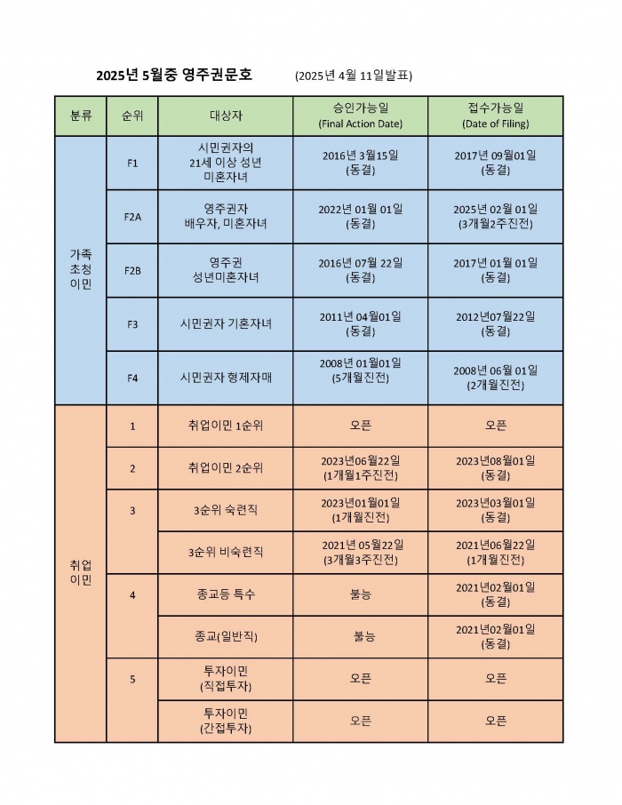 미국 국무부(DOS)는 4월 11일 2025년 5월중 영주권문호(Visa Bulletin)를 발표했습니다. 5월 영주권문호에서는 가족이민은 승인가능일(Final Action Date)에서 형제초청(F4)이 오래간만에 5개월 진전되었으며 접수가능일(Filing Date)에서는 영주권자 배우자(F2A)와 미성년자녀가 3개월2주,형제초청이 2개월 진전이 있었습니다.