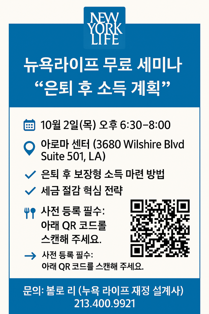 초대합니다|뉴욕라이프 주최 무료 ‘은퇴 후 소득 계획 & 절세 전략’ 세미나